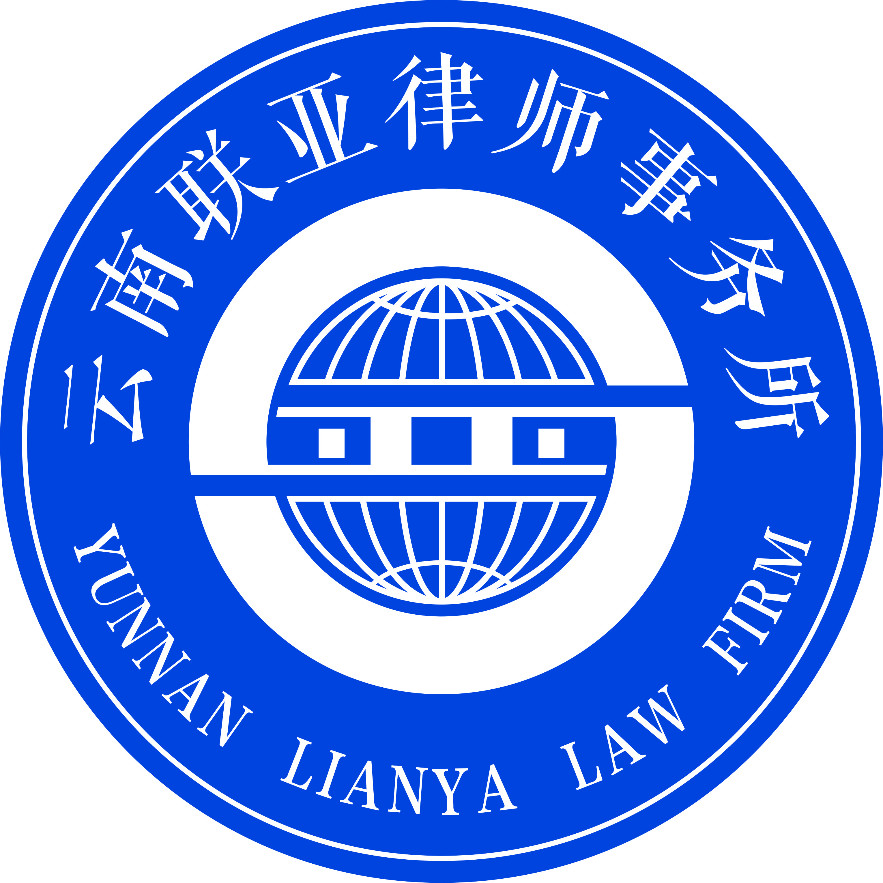 形体释意:圆形象征云南联亚律师事务所团队及原则性和灵活性相结合的办事法则。整体还呈现出一个e,意味互联网大数据下的律师事务所。蓝色,乃蓝天也,象征正义、自由、规范、发展无限,引申为律师是社会主义法治人员的一分子;经线,代表连接,谐音为"联"。中间两只眼睛似明察秋毫;一个亚字,意为连接亚洲,放眼未来,共创辉煌。经线与亚字呈现出开放的样式,象征联亚不断发展的前景。